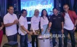 EVP Telkom Regional II Area Jababotabek Teuku Muda Nanta (dari kiri), Dirut Metranet Widi Nugroho, Direktur Consumer Service Telkom Siti Choirina, Artis Yura Yunita, Direktur Rajawali Indonesia Communication Anas Syahrul Alimi, dan Dirut Melon Indonesia Dedi Suherman menabuh drum sebagai tanda peluncuran channel i-Konser di Jakarta, Rabu (29/1). (FOTO : Yogi Ardhi/Republika)