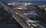 Antrean truk pembawa meterial pembangunan rumah sakit di Kota Wuhan, Provinsi Hubei. Pemerintah China memerintahkan pembangunan rumah sakit baru untuk menampung ribuan korban Virus Corona. Pemerintah setempat menargetkan pembangunan rumah sakit ini selesai dalam waktu sepekan. (Chinatopix via AP) (FOTO : CHINATOPIX)