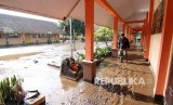 Seorang guru mengecek sekolah SDN 1 Sempol yang terdampak material lumpur akibat banjir bandang di Sempol, Ijen, Bondowoso, Jawa Timur, Kamis (30/1/2020). (FOTO : Antara/Budi Candra Setya)