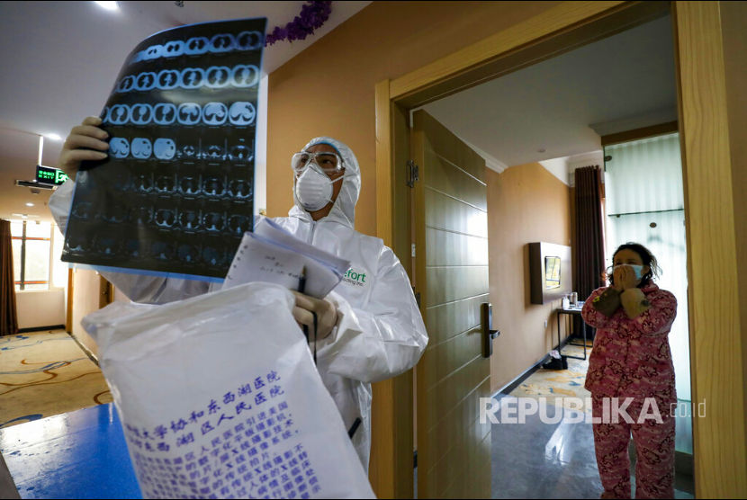 Seorang dokter dengan pakaian pelindung memeriksa pasien di hotel yang digunakan sebagai tempat isolasi warga di Wuhan, Hubei, China, senin(3/2). (FOTO : Chinatopix via AP Photo)