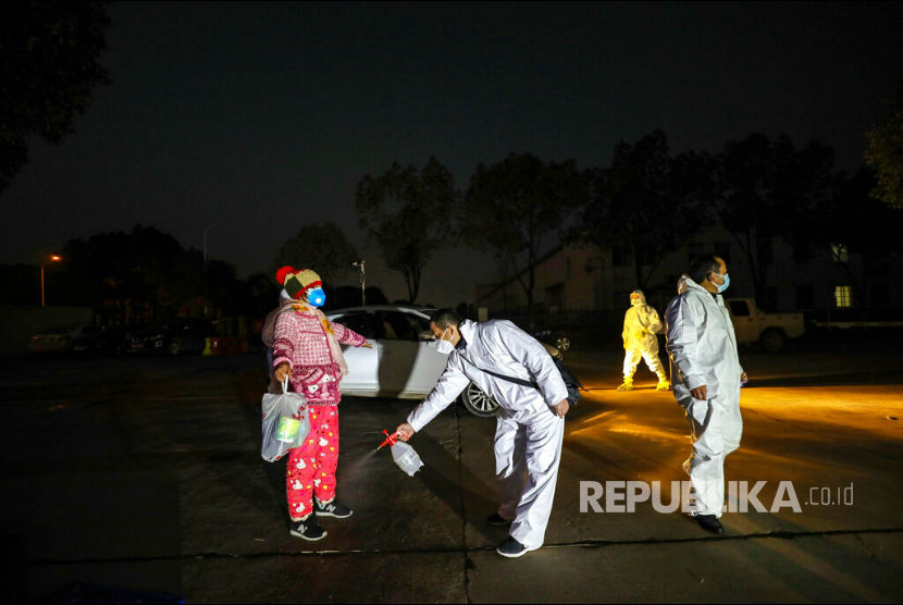 Pekerja dengan pakaian pelindung mengantar penghuni hotel yang digunakan sebagai tempat isolasi warga di Wuhan, Hubei, China, senin(3/2). (FOTO : Chinatopix via AP Photo)