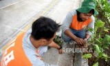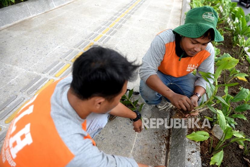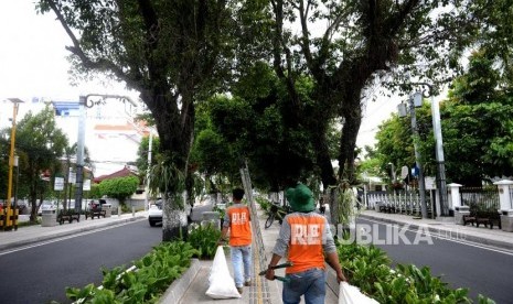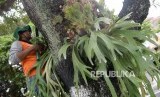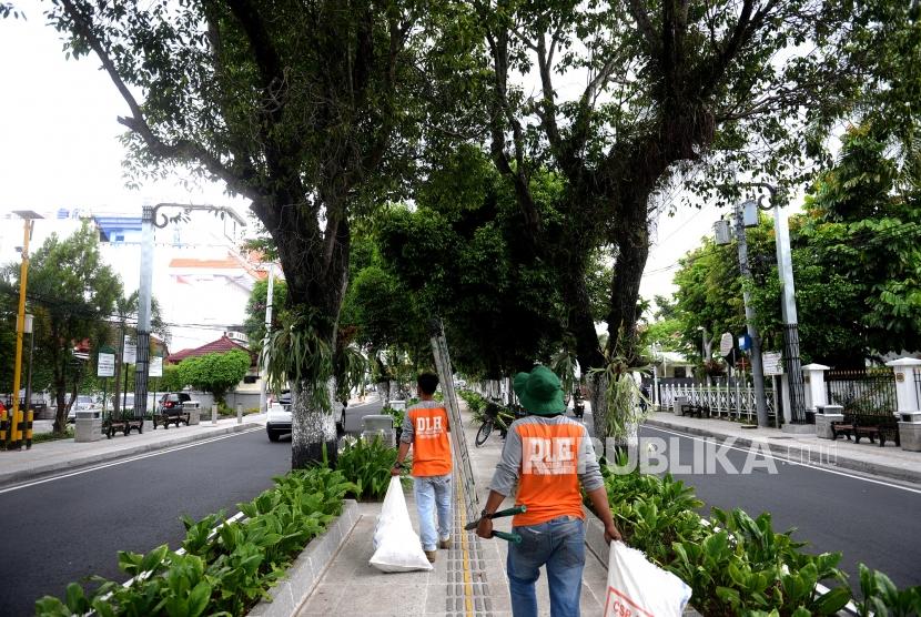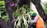Perawatan Anggrek lur Pedestrian. Petugas Dinas Lingkungan Hidup memeriksa kondisi anggrek di jalur pedestrian Jalan Suroto, Yogyakarta, Rabu (5/2). (FOTO : Republika/ Wihdan)