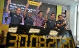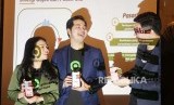 Head of Third Party Gojek Sony Radhityo (tengah) VP Coorporate Communication Gojek Group Kristy Nelwan (kiri) dan CEO PasarPolis Cleosent Randing berbincang mengenai aplikasi GoSure pada acara peluncuran GoSure yang merupakan sinergi antara Gojek dan Pasar Polis, di Jakarta, Rabu (5/2). (FOTO : darmawan / republika)