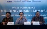 Direktur Utama Bio Farma Honesti Basyir (tengah) bersama Direktur Utama Kimia Farma Verdi Budidarmo (kanan) dan Direktur Utama Indofarma Arief Pramuhanto (kiri) memberikan keterangan terkait holding BUMN farmasi di Jakarta, Rabu (5/2). (FOTO : Republika/Prayogi)