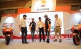 Technology and Development Manager, Pacific Lubritama Indonesia Victor Gomez, Pembalap MotoGP Repsol Honda 2020Marc Marquez, CEO Pacific Lubritama Indonesia Tony Legi, Pembalap MOtoGP Repsol Honda 2020 Alex Marquez, Director Repsol Lubricants & Specialized Products Sebastian Mussini (dari kiri) berbincang saat Repsol Lubricant Show di Jakarta, Rabu (5/2). (FOTO : Tahta Aidilla/Republika)