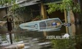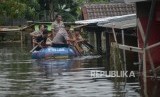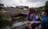 REPUBLIKA.CO.ID, TANGERANG -- Sejumlah warga menaiki perahu karet saat banjir di kawasan Perumahan Periuk Damai, Kota Tangerang, Banten, Kamis (6/2).