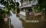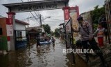 Sejumlah warga beraktivitas saat banjir di kawasan Perumahan Periuk Damai, Kota Tangerang, Banten, Kamis (6/2). (FOTO : Republika/Thoudy Badai)