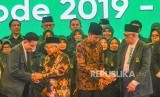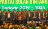 Ketua Umum Partai Bulan Bintang (PBB) Yusril Ihza Mahendra (kiri depan) menerima bendera Partai dari Ketua Majelis Syuro PBB KH. Muqoddas Murtadla (kanan depan) saat Pelantikan Pengurus Dewan Pimpinan Pusat Partai Bulan Bintang di Jakarta, Kamis (6/2/2020). (FOTO : MUHAMMAD ADIMAJA/ANTARA FOTO)