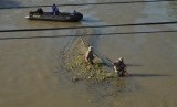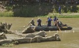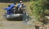 Petugas menunggu buaya liar yang terjerat ban sepeda motor muncul ke permukaan air di Sungai Palu di Palu, Sulawesi Tengah, Kamis (6/2/2020). (FOTO : ANTARA FOTO)