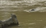 Buaya liar yang terjerat ban sepeda motor bersembunyi disekitar reruntuhan beton saat berlangsungnya proses penyelamatan di Sungai Palu, Sulawesi Tengah, Jumat (7/2/2020). (FOTO : ANTARA FOTO)