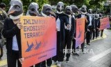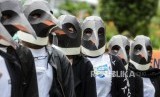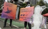 Aktivis Greenpeace menggunakan kostum penguin saat aksi di Jalan MH Thamrin, Jakarta, Ahad (9/2). (FOTO : Republika/Putra M. Akbar)