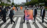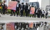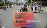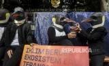 Aktivis Greenpeace menggunakan kostum penguin usai aksi di Jalan MH Thamrin, Jakarta, Ahad (9/2). (FOTO : Republika/Putra M. Akbar)