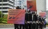 REPUBLIKA.CO.ID, JAKARTA -- Aktivis Greenpeace menggunakan kostum penguin saat aksi di Jalan MH Thamrin, Jakarta, Ahad (9/2).
