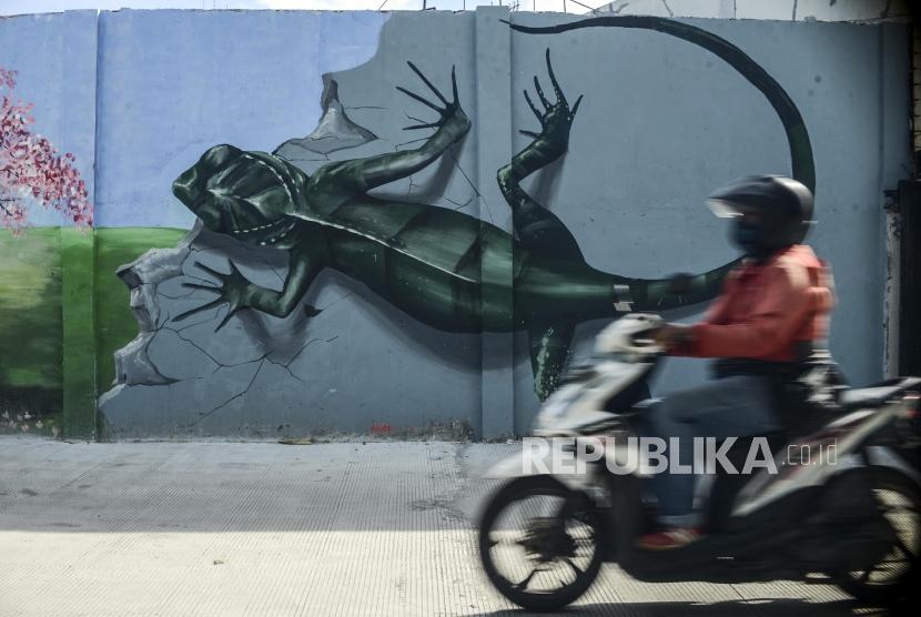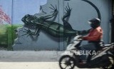 Pengendara motor melintas di dekat tembok yang digambari mural di Bantaran Kali Opak, Penjaringan, Jakarta, Senin (10/2). (FOTO : Republika/Putra M. Akbar)