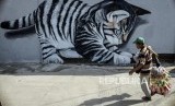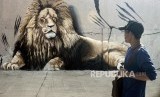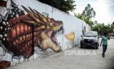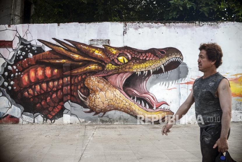 REPUBLIKA.CO.ID, JAKARTA -- Warga melintas di dekat tembok yang digambari mural di Bantaran Kali Opak, Penjaringan, Jakarta, Senin (10/2).