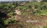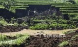 Kondisi lahan persawahan dan kolam ikan yang terdampak longsor akibat pergerakan tanah di Kampung Hegarmanah, Desa Sukatani, Kecamatan Ngamprah, Kabupaten Bandung Barat, Rabu (12/2). (FOTO : REPUBLIKA)