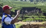 Petugas mengambil gambar menggunakan gawai lahan persawahan dan kolam ikan yang terdampak longsor akibat pergerakan tanah di Kampung Hegarmanah, Desa Sukatani, Kecamatan Ngamprah, Kabupaten Bandung Barat, Rabu (12/2). (FOTO : REPUBLIKA)
