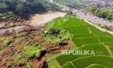 Foto udara area persawahan yang longsor akibat pergerakan tanah di Desa Sukatani, Ngamprah, Kabupaten Bandung Barat, Jawa Barat, Rabu (12/2/2020). (FOTO : Antara/M Agung Rajasa)