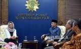 Menlu Temui Ketum PP Muhammadiyah. Menlu Retno Marsudi (kiri) bersama Ketum PP Muhammadiyah Haedar Nashir saati pertemuan tertutup di Kantor PP Muhammadiyah, Yogyakarta, Rabu (12/2). (FOTO : Wihdan Hidayat/ Republika)