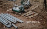 Pekerja dibantu alat berat menyelesaikan proyek Pasar Senen Blok I dan II di Kawasan Pasar Senen, Jakarta Pusat, Rabu (12/2). (FOTO : Republika/Thoudy Badai)