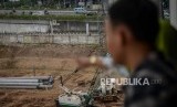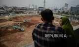 Warga mengamati pembangunan proyek Pasar Senen Blok I dan II di Kawasan Pasar Senen, Jakarta Pusat, Rabu (12/2). (FOTO : Republika/Thoudy Badai)