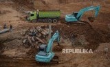 Pekerja dibantu alat berat menyelesaikan proyek pembangunan Pasar Senen Blok I dan II di Kawasan Pasar Senen, Jakarta Pusat, Rabu (12/2). (FOTO : Republika/Thoudy Badai)