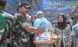 Panglima TNI Marsekal TNI Hadi Tjahjanto (kiri) memberikan bantuan kepada warga saat melakukan kunjungan ke Posko Bakti Kesehatan di Ranai, Natuna, Kepulauan Riau, Kamis (13/2/2020). (FOTO : Antara/Muhammad Adimaja)