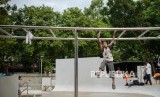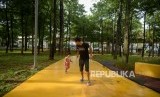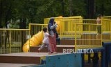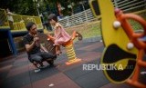 Orang tua bermain bersama anak di salah satu fasilitas permainan di area Taman Puring, Jakarta, Jumat (14/2). (FOTO : Republika/Thoudy Badai)