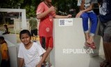 Sejumlah anak didampingi orang tuanya bermain di salah satu fasilitas permainan di area Taman Puring, Jakarta, Jumat (14/2). (FOTO : Republika/Thoudy Badai)
