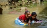 Dua orang anak bermain di pemakaman yang terendam banjir di Cilisung, Dayeuhkolot, Kabupaten Bandung, Jawa Barat, Senin (17/2/2020). (FOTO : Antara/Raisan Al Farisi)