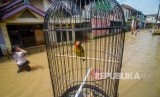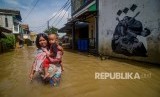 REPUBLIKA.CO.ID, BANDUNG -- Seorang warga sambil menggendong balita menerjang banjir di Bojongasih, Dayeuhkolot, Kabupaten Bandung, Jawa Barat, Senin (17/2/2020).