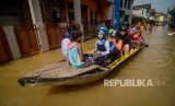 Sejumlah warga menaiki perahu melintasi banjir di Bojongasih, Dayeuhkolot, Kabupaten Bandung, Jawa Barat, Senin (17/2/2020). (FOTO : Antara/Raisan Al Farisi)