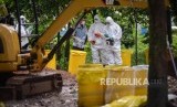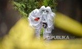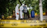 Petugas Kesatuan KBR (Kimia Biologi Radioaktif) Gegana Mabes Polri bersama petugas PTKMR (Pusat Teknologi Keselamatan Meteorologi Radiasi) mengukur paparan radiasi di area terpapar di Perumahan Batan Indah, Kota Tangerang Selatan, Banten, Senin (17/2). (FOTO : Republika/Thoudy Badai)