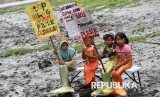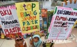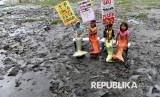 REPUBLIKA.CO.ID, SURABAYA -- Sejumlah anak dengan kostum putri duyung membentangkan poster saat aksi di Sungai Kalimas, Surabaya, Jawa Timur, Senin (17/2/2020).