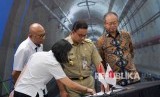 Gubernur DKI Jakarta Anies Baswedan (kedua kanan) bersama Direktur Utama MRT Jakarta, William Sabandar (kedua kiri), Direktur Konstruksi PT MRT Jakarta Silvia Halim (kiri) dan Representative Shimizu-Adhi Joint Venture Yutaka Okumura (kanan) mengamati naskah penandatanganan kerja sama (MOU) proyek pembangunan MRT fase 2A dan lingkup kerja CP201 di Stasiun Bundaran Hotel Indonesia (HI), Jakarta, Senin (17/2/2020). (FOTO : Antara/M Risyal Hidayat)