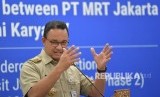 Gubernur DKI Jakarta Anies Baswedan menyampaikan sambutan disela-sela penandatanganan kerja sama (MOU) proyek pembangunan MRT fase 2A dan lingkup kerja CP201 di Stasiun Bundaran Hotel Indonesia (HI), Jakarta, Senin (17/2/2020). (FOTO : Antara/M Risyal Hidayat)