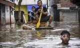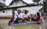 Sejumlah anak menggunakan rakit melintasi genangan banjir di Kampung Bojong Asih, Kecamatan Dayeuhkolot, Kabupaten Bandung, Selasa (18/2). (FOTO : Republika/Abdan Syakura)