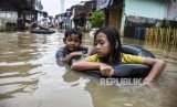 Sejumlah anak menggunakan ban bekas melintasi genangan banjir di Kampung Bojong Asih, Kecamatan Dayeuhkolot, Kabupaten Bandung, Selasa (18/2). (FOTO : Republika/Abdan Syakura)