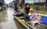 Warga bersama anaknya menggunakan rakit melintasi genangan banjir di Kampung Bojong Asih, Kecamatan Dayeuhkolot, Kabupaten Bandung, Selasa (18/2). (FOTO : Republika/Abdan Syakura)