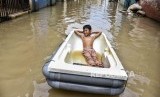 Seorang anak berada di atas rakit yang terbuat dari bak mandi di Kampung Bojong Asih, Kecamatan Dayeuhkolot, Kabupaten Bandung, Selasa (18/2). (FOTO : Republika/Abdan Syakura)