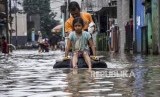 Warga mendorong rakit yang ditumpangi anaknya melintasi genangan banjir di Kampung Bojong Asih, Kecamatan Dayeuhkolot, Kabupaten Bandung, Selasa (18/2). (FOTO : Republika/Abdan Syakura)