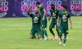 Pemain Persebaya David Da Silva (kiri) melakukan selebrasi usai mencetak gol pada laga semi final Piala Gubernur Jawa Timur melawan Arema FC yang digelar tanpa penonton di Stadion Gelora Soeprijadi, Blitar, Jawa Timur, Selasa (18/2/2020). (FOTO : Antara/Irfan Anshori)
