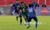 Pemain Persebaya Nasir (tengah) menggiring bola melewati hadangan pemain Arema FC Taufik (kanan) pada laga semi final Piala Gubernur Jawa Timur yang digelar tanpa penonton di Stadion Gelora Soeprijadi, litar, Jawa Timur, Selasa (18/2/2020). (FOTO : Antara/Irfan Anshori)