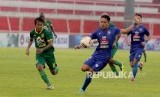 Pemain Arema FC Ridwan Tawanela (kanan) menggiring bola melewati hadangan pemain Persebaya Supriyadi pada laga semi final Piala Gubernur Jawa Timur yang digelar tanpa penonton di Stadion Gelora Soeprijadi, litar, Jawa Timur, Selasa (18/2/2020). (FOTO : Antara/Irfan Anshori)