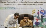 Menteri Agama Fachrul Razi (kanan) bersiap menyampaikan keterangan saat jumpa pers kinerja Kementerian Agama di Jakarta, Selasa (18/2). (FOTO : Republika/Putra M. Akbar)