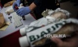 Petugas Direktorat Narkoba Polda Metro Jaya melakukan uji laboratorium saat pemusnahan barang bukti narkoba di Polda Metro Jaya, Jakarta, Rabu (19/2). (FOTO : Republika/Thoudy Badai)