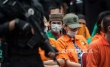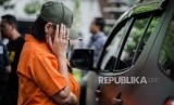 Tersangka kasus narkoba dengan initial LL menghadiri pemusnahan barang bukti narkoba di Polda Metro Jaya, Jakarta, Rabu (19/2). (FOTO : Republika/Thoudy Badai)