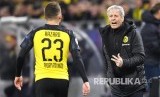 Manager Lucien Favre memberikn instruksi kepada Thorgan Hazard pada laga leg pertama 16 besar Liga Champions antara Borussia Dortmund melawan Paris Saint Germain di Dortmund, Jerman, Rabu (19/02) dini hari. (FOTO : Martin Meissner/AP Photo)