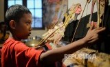 Seorang anak belajar mementaskan wayang sebagai dalang di Sanggar Nirmalasari, Cinere, Depok. (FOTO : Thoudy Badai)