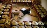 Seorang anak didik beristirahat di antara deretan gamelan bonang di Sanggar Nirmala Sari, Cinere, Depok. (FOTO : Thoudy Badai)
